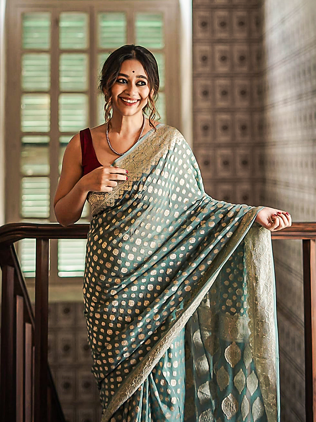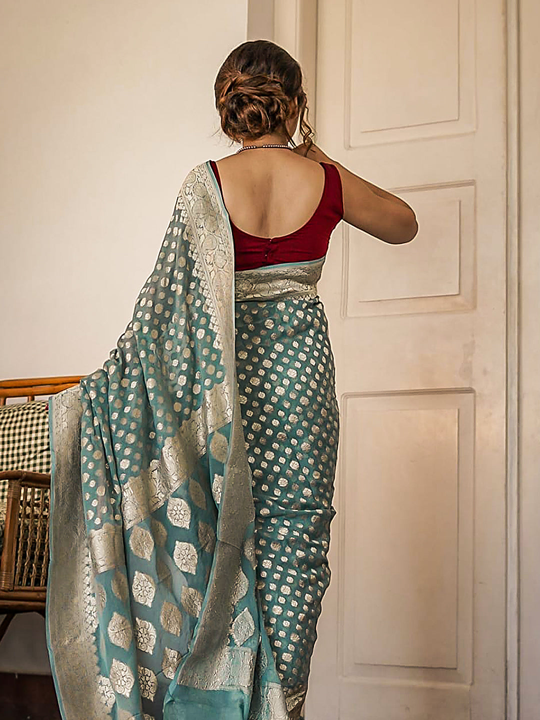 Color: Elegant Sage Green with radiant gold zari – a distinctive and sophisticated choice.