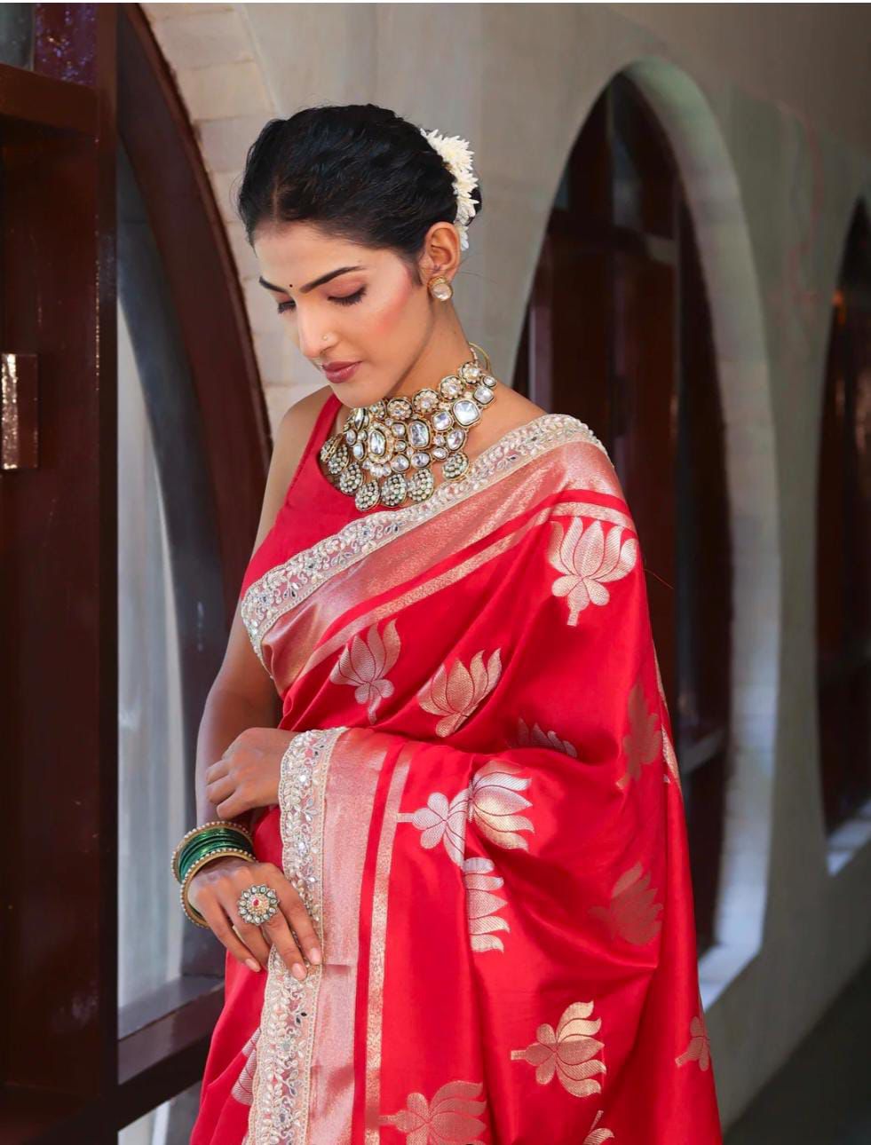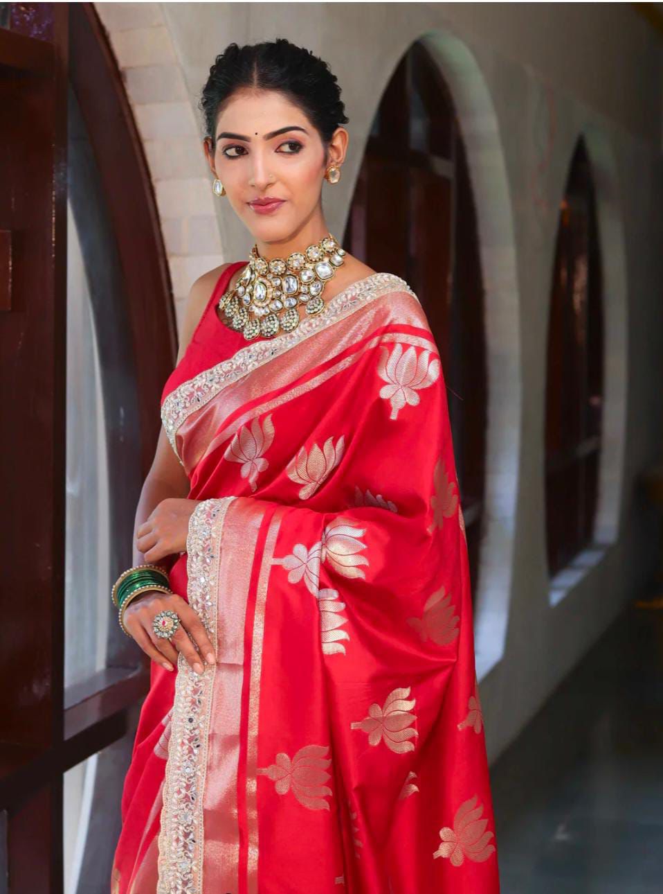 Opulent Ruby Red Banarasi Silk Saree with Gold & Silver Zari Lotus Motifs