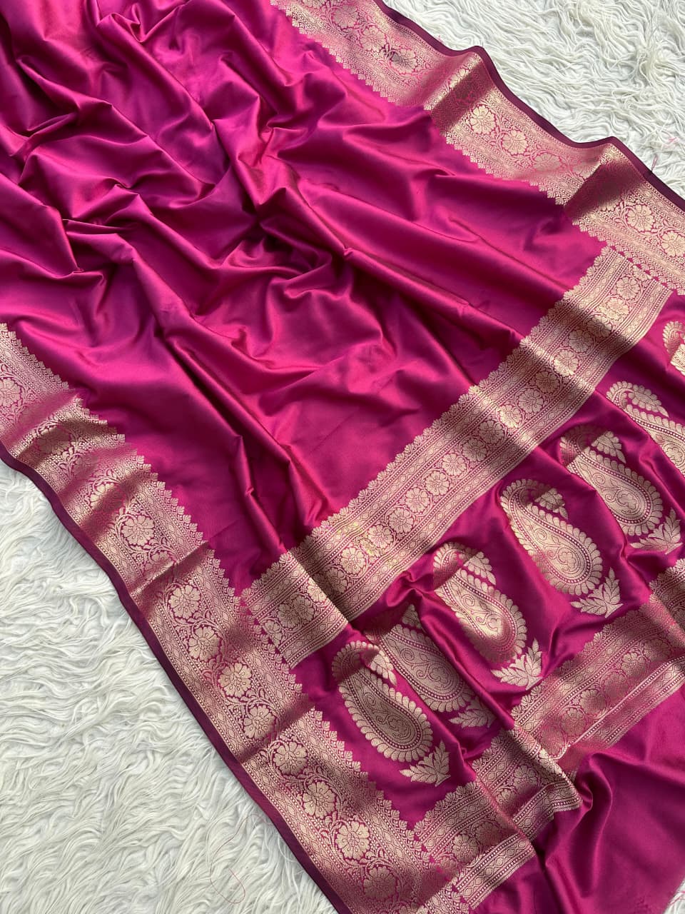 The highlight of this saree is its spectacular grand Zari woven border, featuring intricate traditional motifs and patterns that showcase the unparalleled artistry of Kanchipuram weavers. The pallu is equally captivating, adorned with magnificent Zari paisley motifs that flow elegantly, adding to its majestic charm. The rich magenta body beautifully contrasts with the golden Zari work, creating a visually striking and luxurious ensemble.