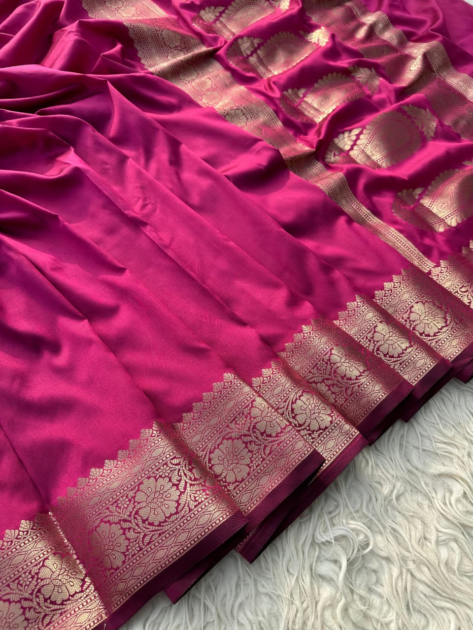 The saree features a vibrant and captivating magenta hue, a rich and dynamic color that exudes confidence, joy, and cultural richness. Crafted from authentic Kanchipuram silk, renowned for its superior quality, lustrous sheen, and durable texture, this saree promises both unparalleled comfort and a truly opulent presence.