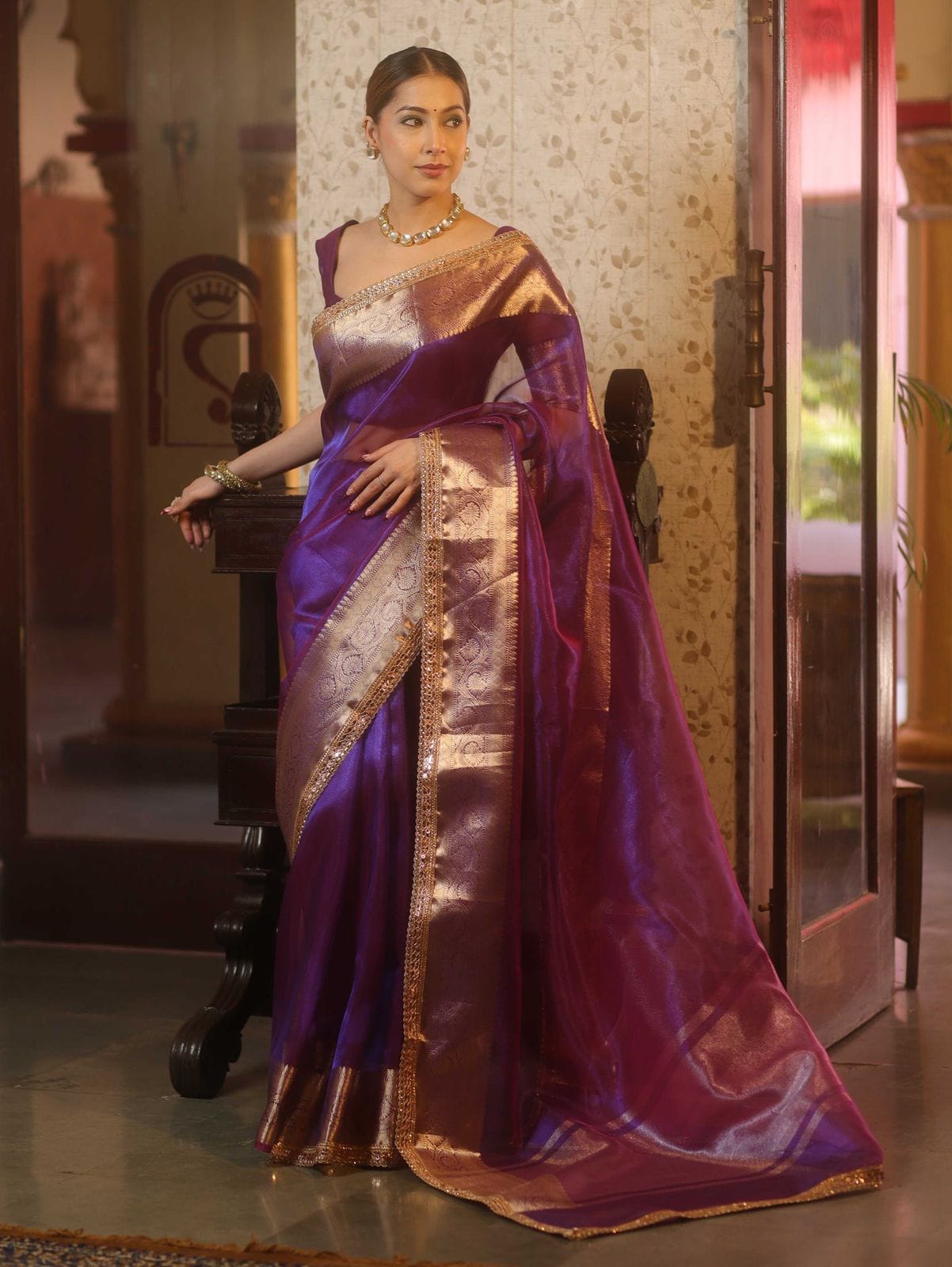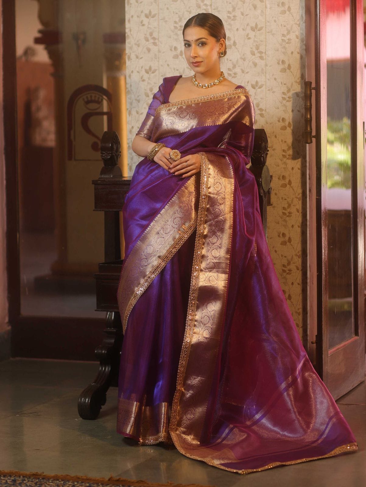 Experience the grandeur of royalty with our Royal Purple Banarasi Organza Silk Saree, where heritage craftsmanship meets modern elegance.