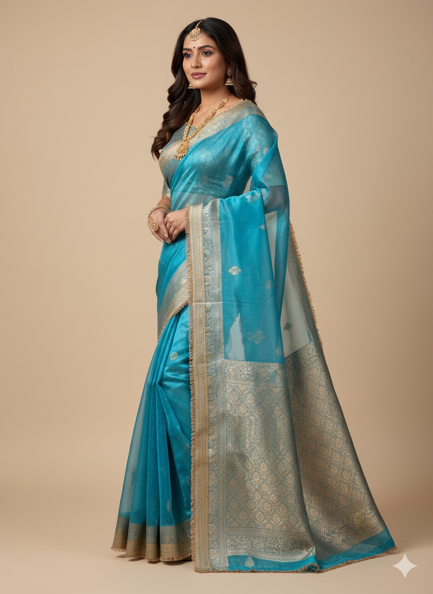 Float into elegance with our enchanting Sky Blue Organza Saree, a breathtaking blend of delicate translucence and rich traditional artistry. This ethereal saree is a perfect choice for festive celebrations, daytime events, and sophisticated gatherings where you wish to exude serene charm.